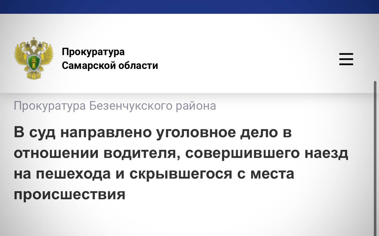Прокуратура Безенчукского района Самарской области утвердила обвинительное заключение по уголовному делу в отношении 37-летнего мужчины. Он обвиняется по п. «б» ч. 4 ст. 264 УК РФ (нарушение лицом, управляющим автомобилем, правил дорожного движения, повлекшее по неосторожности смерть человека и сопряженное с оставлением места его совершения).