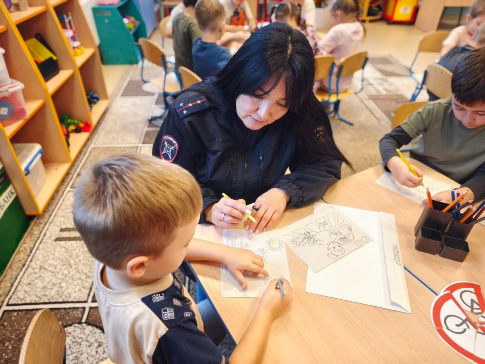 Вместе с полицейским малыши обсудили, как правильно переходить проезжую часть, вспомнили значение сигналов светофора и дорожных знаков.