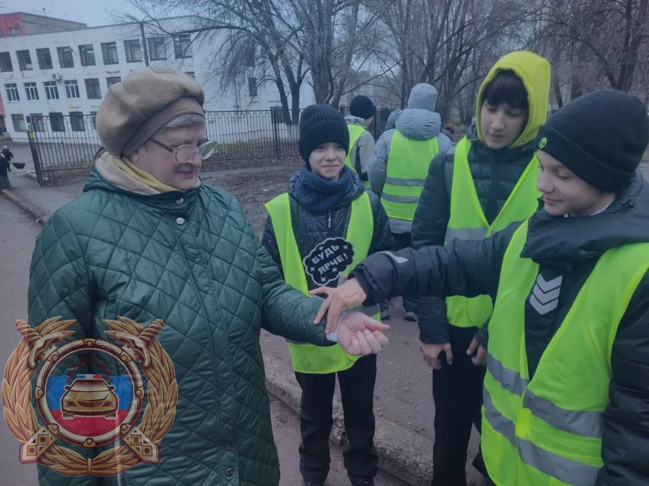 Школьники вместе с инспекторами вручали водителям и пешеходам световозвращающие элементы и напоминали о необходимости соблюдения правил дорожного движения.