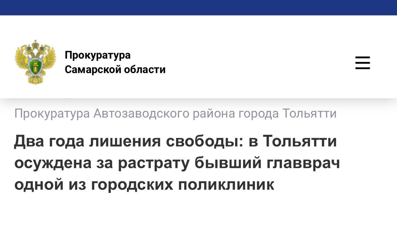 Прокуратура Автозаводского района г. Тольятти поддержала государственное обвинение по уголовному делу в отношении бывшего руководителя одной из городских поликлиник. Она признана виновной по ч. 3 ст. 160 УК РФ (хищение чужого имущества, вверенного виновному, совершенное с использованием лицом своего служебного положения).
