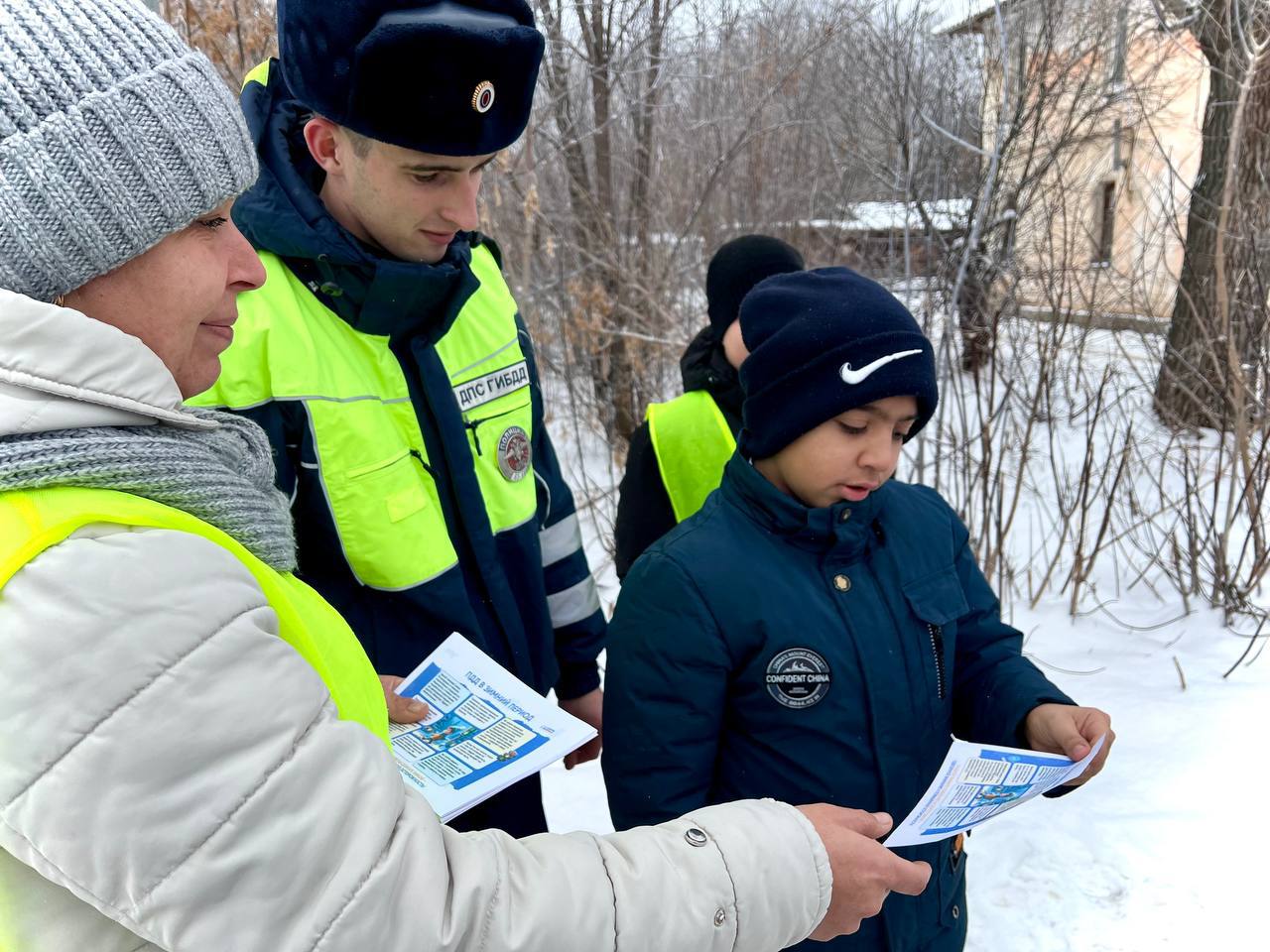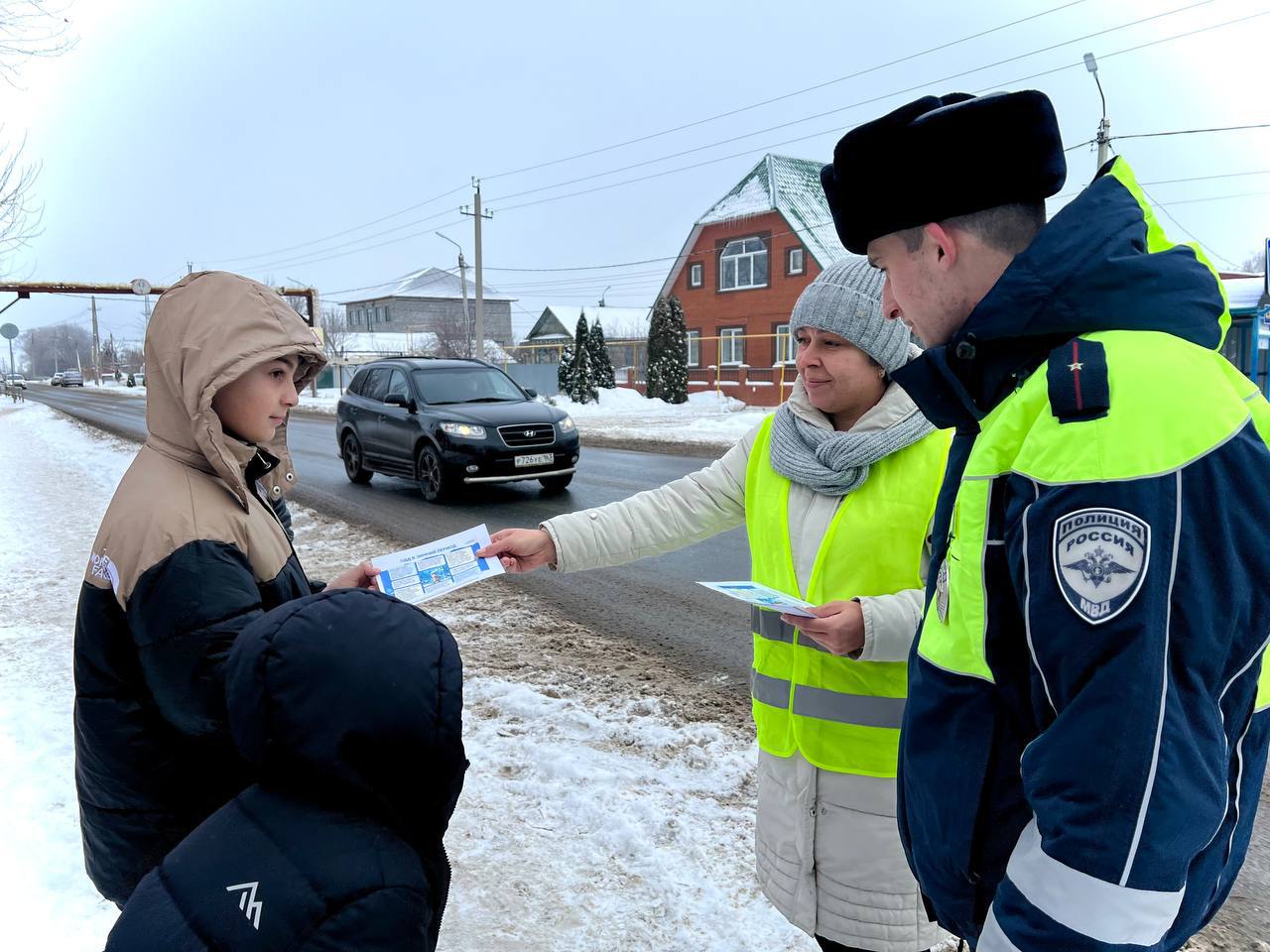 Сотрудники Госавтоинспекции совместно с родительским патрулем напомнили детям о правилах безопасного поведения на дорогах в условиях снега и гололёда, важности перехода проезжей части по пешеходным переходам и на разрешающий сигнал светофора, а также использовании светоотражающих элементов.