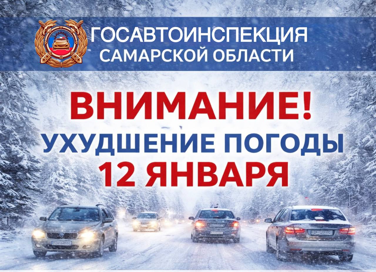Госавтоинспекция Самарской области информирует, что 12 января на территории региона ожидается ухудшение погодных условий: сильный снегопад, метель и образование гололедицы.