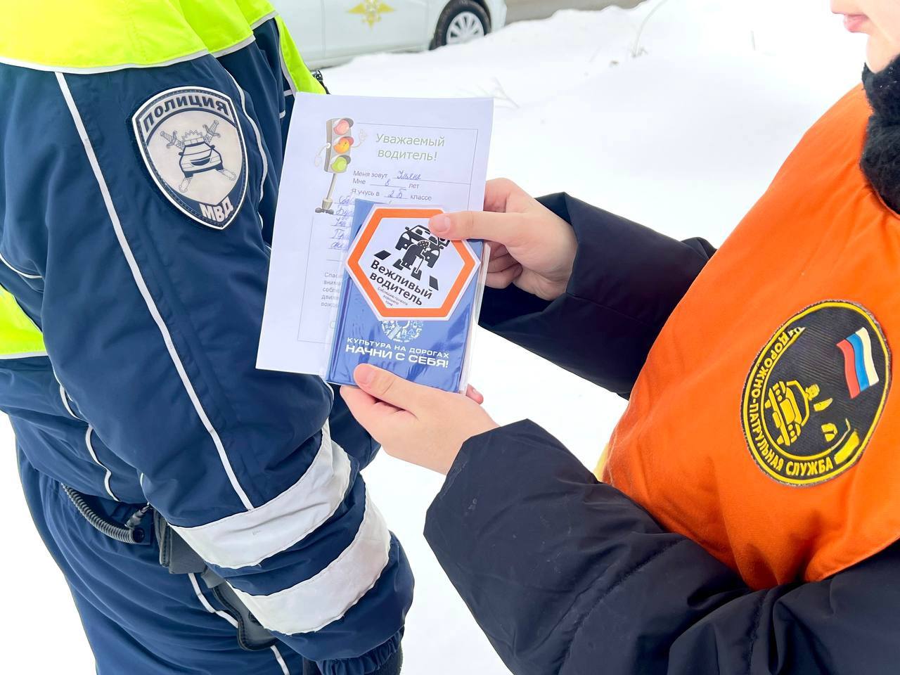 Участникам акции вручили тематические обложки для документов и наклейки «Вежливый водитель».