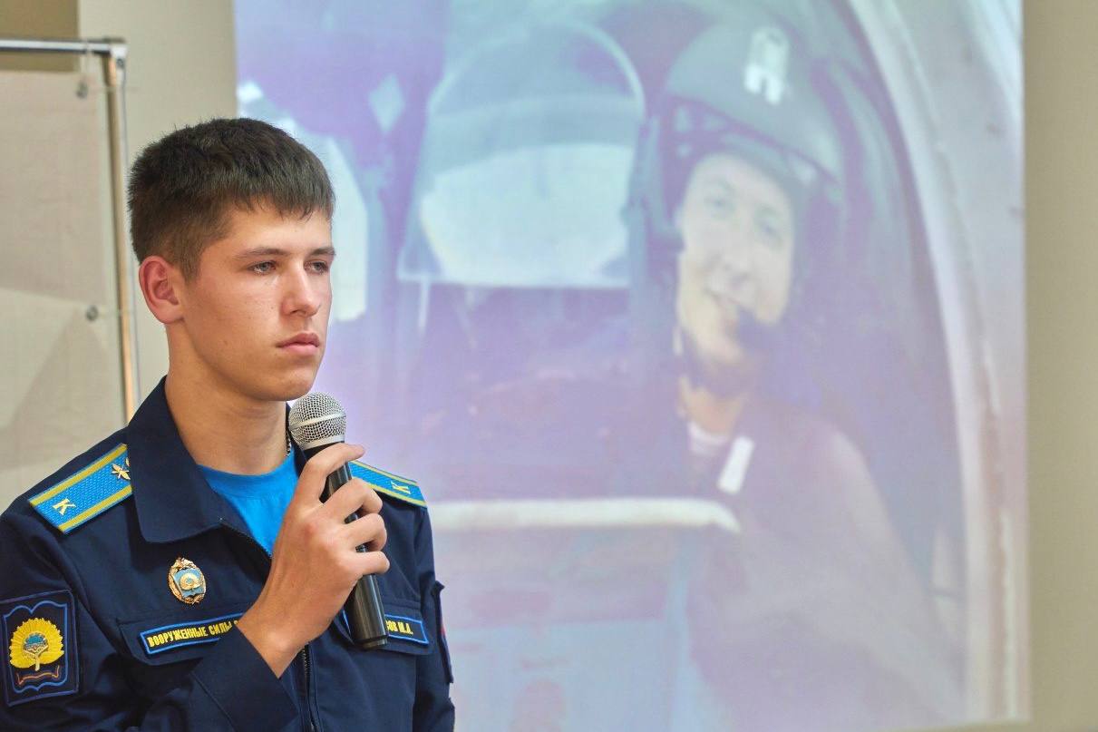 На этой фотографии – курсант Сызранского вертолетного училища Михаил Тарасов рассказывает о своем отце, Герое России Алексее Тарасове, который в 2022 году погиб на СВО.