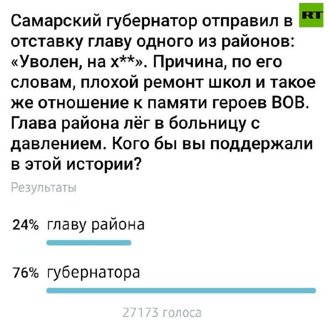 Большинство подписчиков RT поддержали губернатора Самарской области. За три часа в опросе приняли участие более 27 тыс. человек.