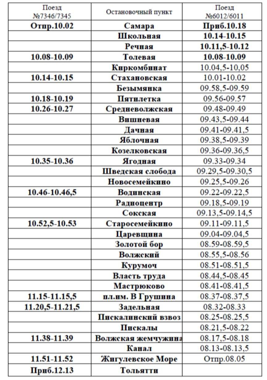 Жигулевское Море (отпр. 08:05) – Толевая (10:08-10:09) – Самара (приб. 10:18)