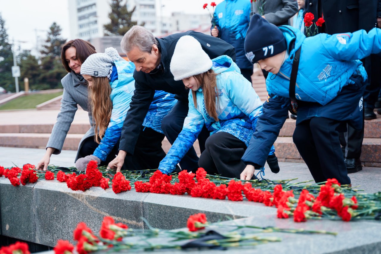 Накануне Парада Памяти члены Совета при Президенте России по развитию физической культуры и спорта возложили цветы к Вечному огню и горельефу «Скорбящей матери - Родине» на площади Славы в Самаре.