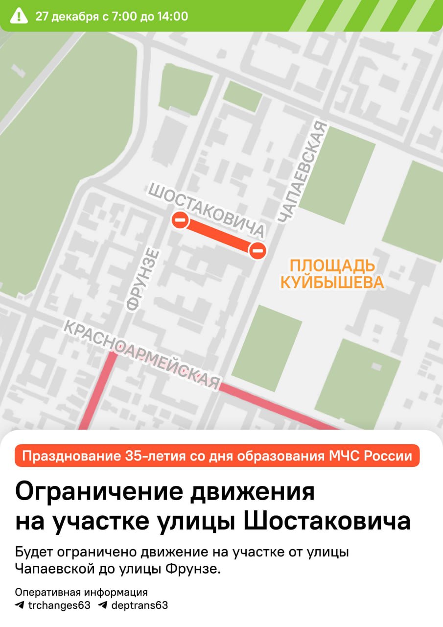 27 декабря в Самаре состоятся мероприятия, посвященные 35-летию со дня образования МЧС России. В их числе – выставка пожарной техники, пожарно-технического оборудования и снаряжения. В связи с этим с 07:00 до 14:00 будет ограничено движение транспорта, в том числе средств индивидуальной мобильности по ул. Шостаковича от ул. Фрунзе до ул. Чапаевской.