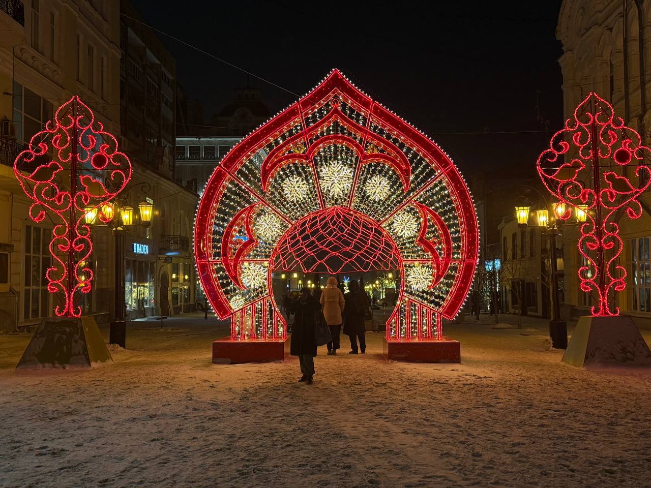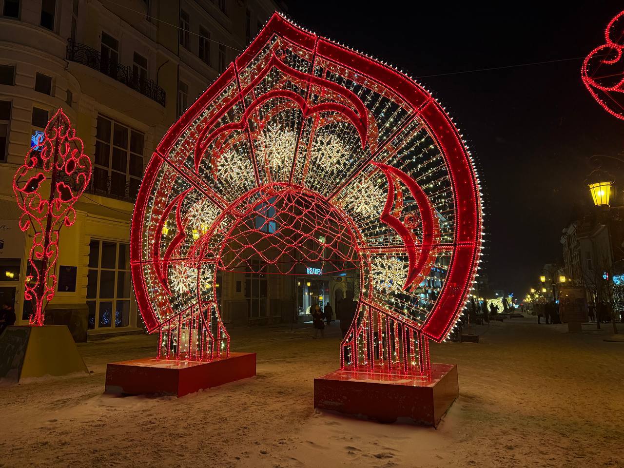 Город продолжают украшать к новогодним праздникам. На главной пешеходной улице установили новый арт-объект – светящийся кокошник!