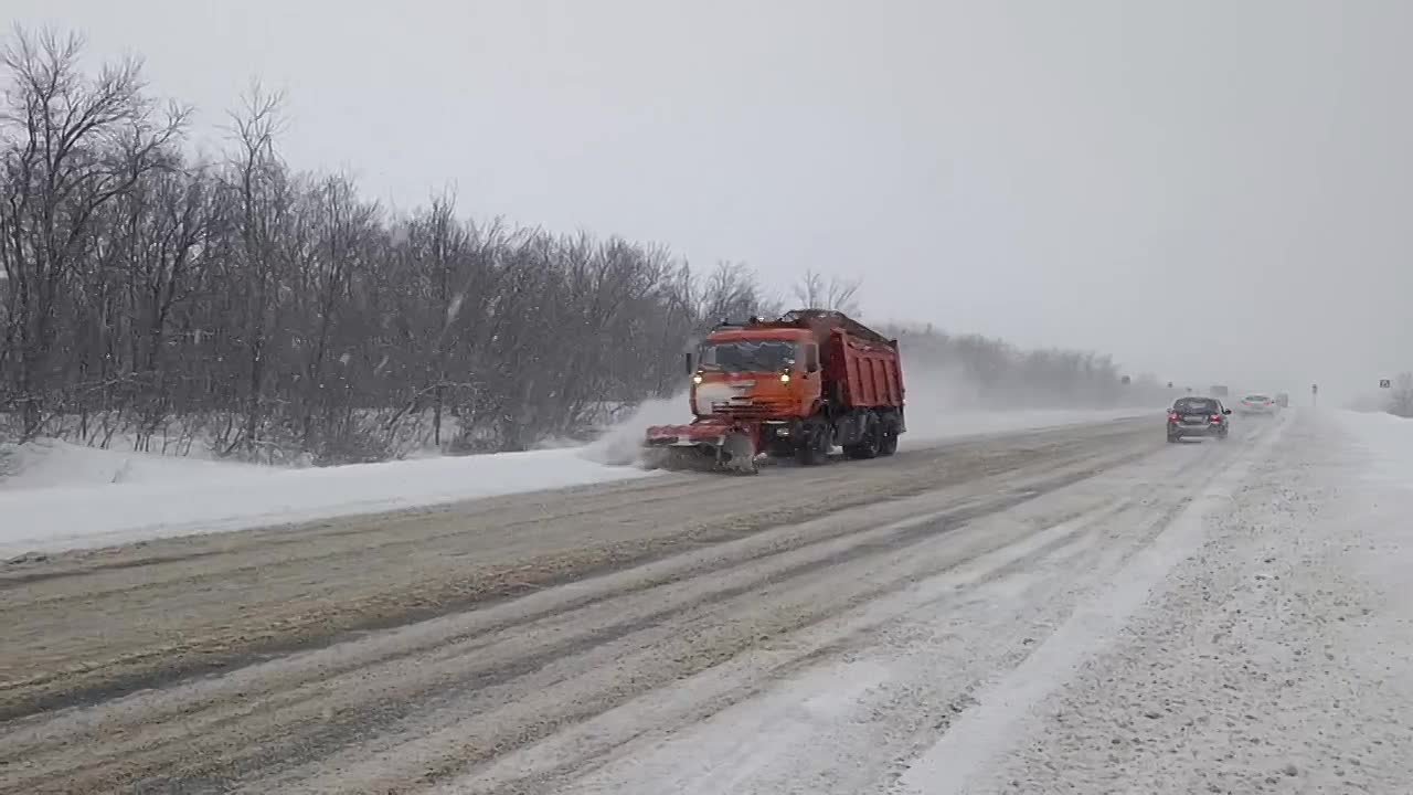 В условиях снегопада, поземки и метели дорожные службы Самарской области работают в усиленном режиме. Для оперативной расчистки и обработки трасс применяется тактика движения автопоездов — колонн из комбинированных дорожных машин (КДМ).