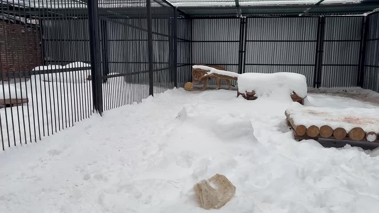 Лев Алтай из зоопарка Самары играет в футбол на снегу