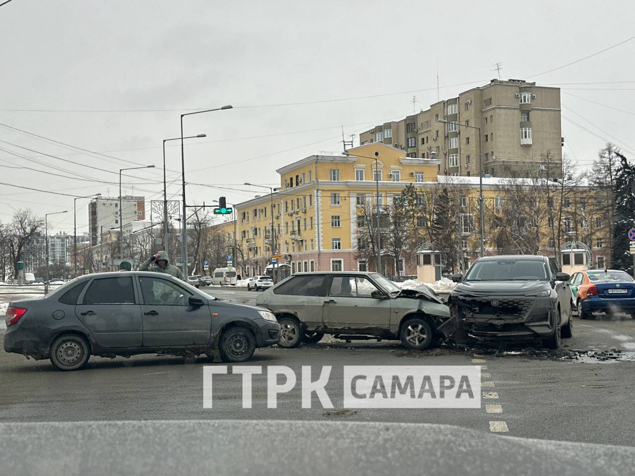В Самаре произошла авария с участием трех машин. Как сообщает наш подписчик, один из водителей выехал на перекресток на красный сигнал светофора, что привело к столкновению.