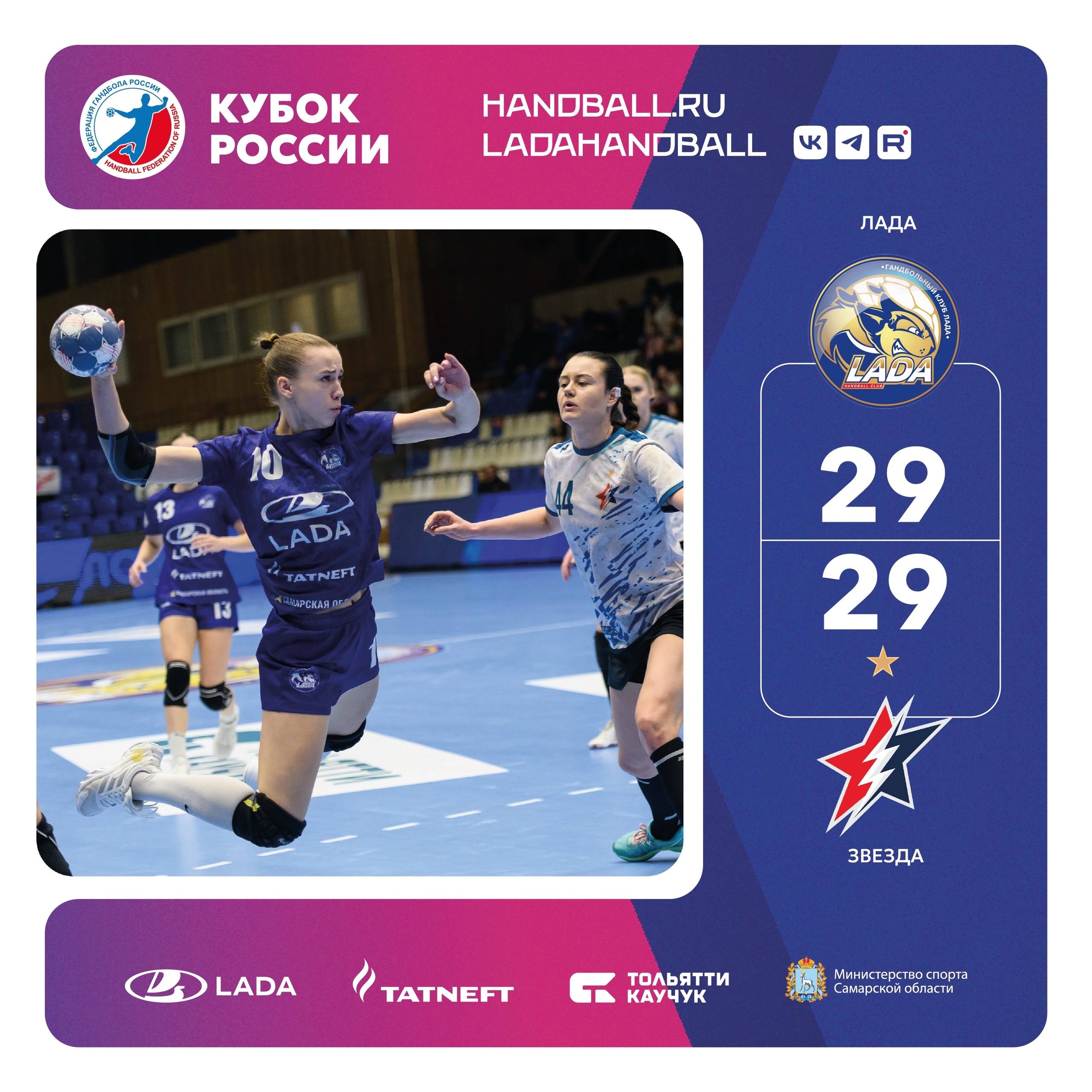В ответном матче 1/4 финала Кубка России в Тольятти Лада сыграла вничью со Звездой из Звенигорода 29:29 (14:13).