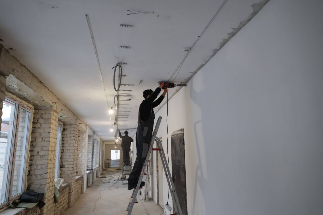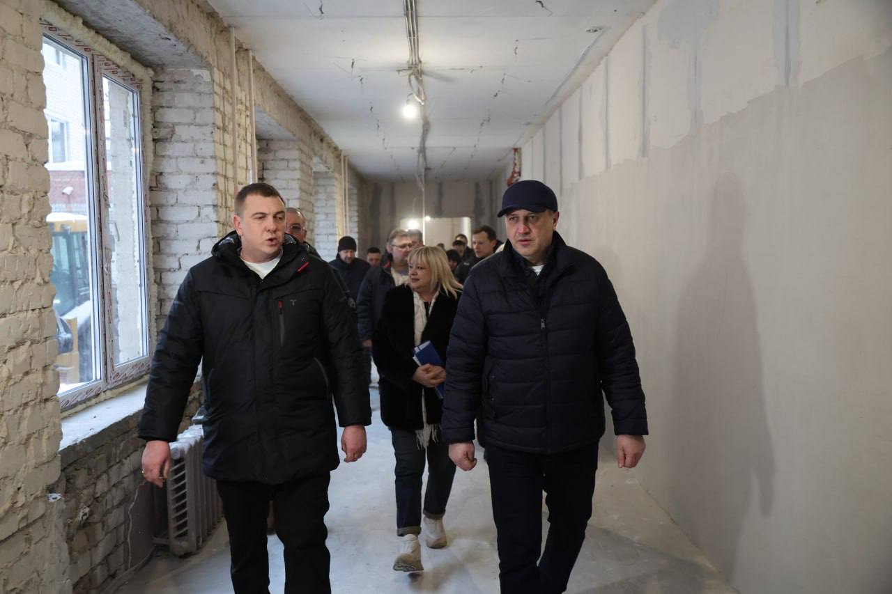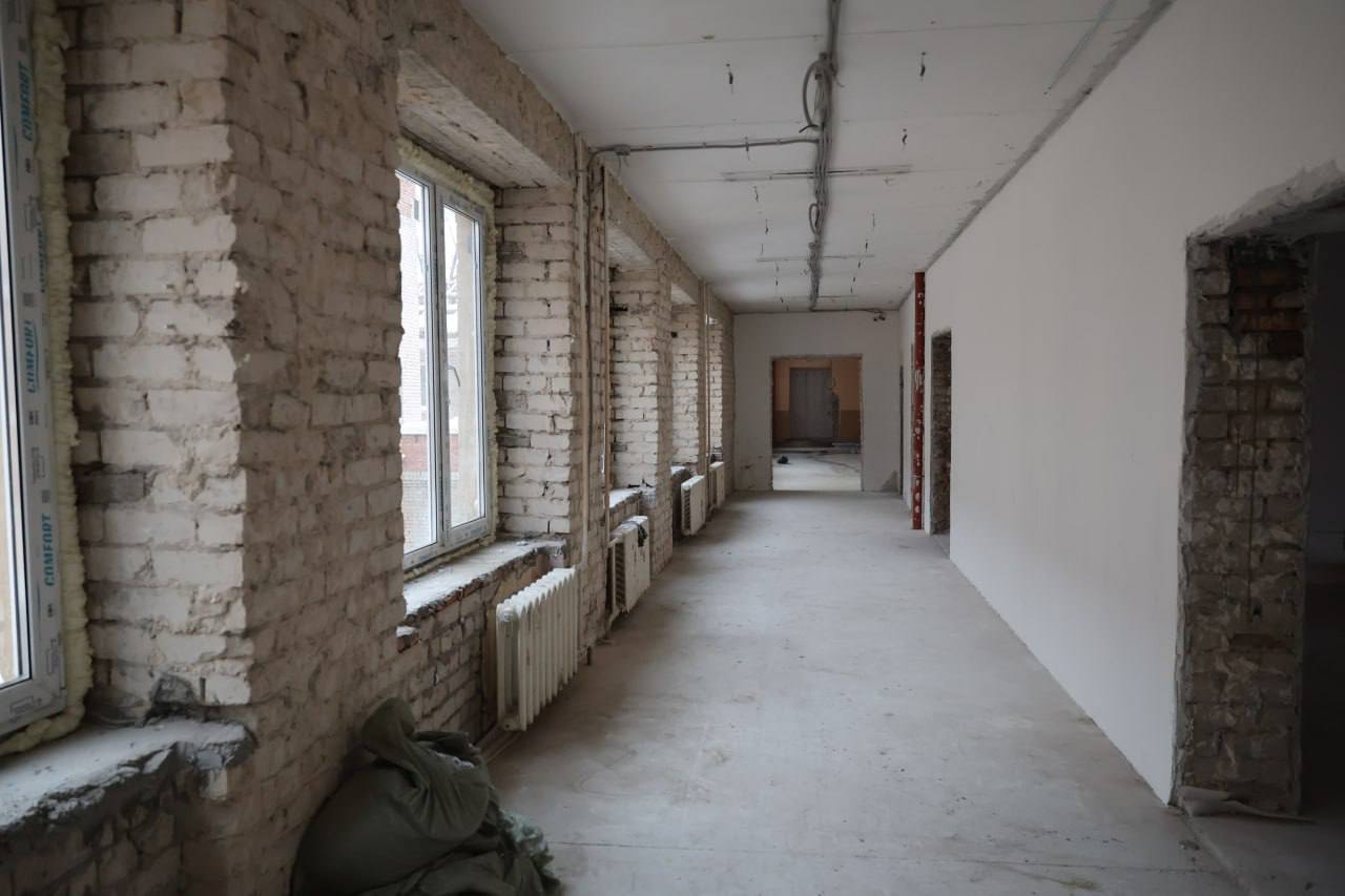 «Здесь сейчас идет масштабный капитальный ремонт с элементами реконструкции. На данный момент работы идут по графику, выполнены на 35%. Закончены демонтажные работы, выполнено устройство мягкой кровли, усилены металлом простенки, сделана стяжка на полах, кирпичная кладка парапетов, перегородок и оконных ниш и некоторые другие работы. В этой школе учатся более 700 ребят, в конце 2026 года они должны прийти в практически новую школу»,