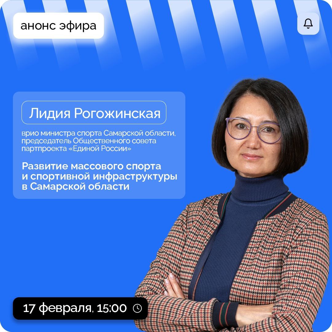 О развитии массового спорта и спортивной инфраструктуры региона. О молодых спортсменах и тренерском составе. О поддержке адаптивного спорта для ветеранов СВО в прямом эфире из Центра управления регионом расскажет врио министра спорта Самарской области, председатель Общественного совета партпроекта «Единой России» Лидия Рогожинская.