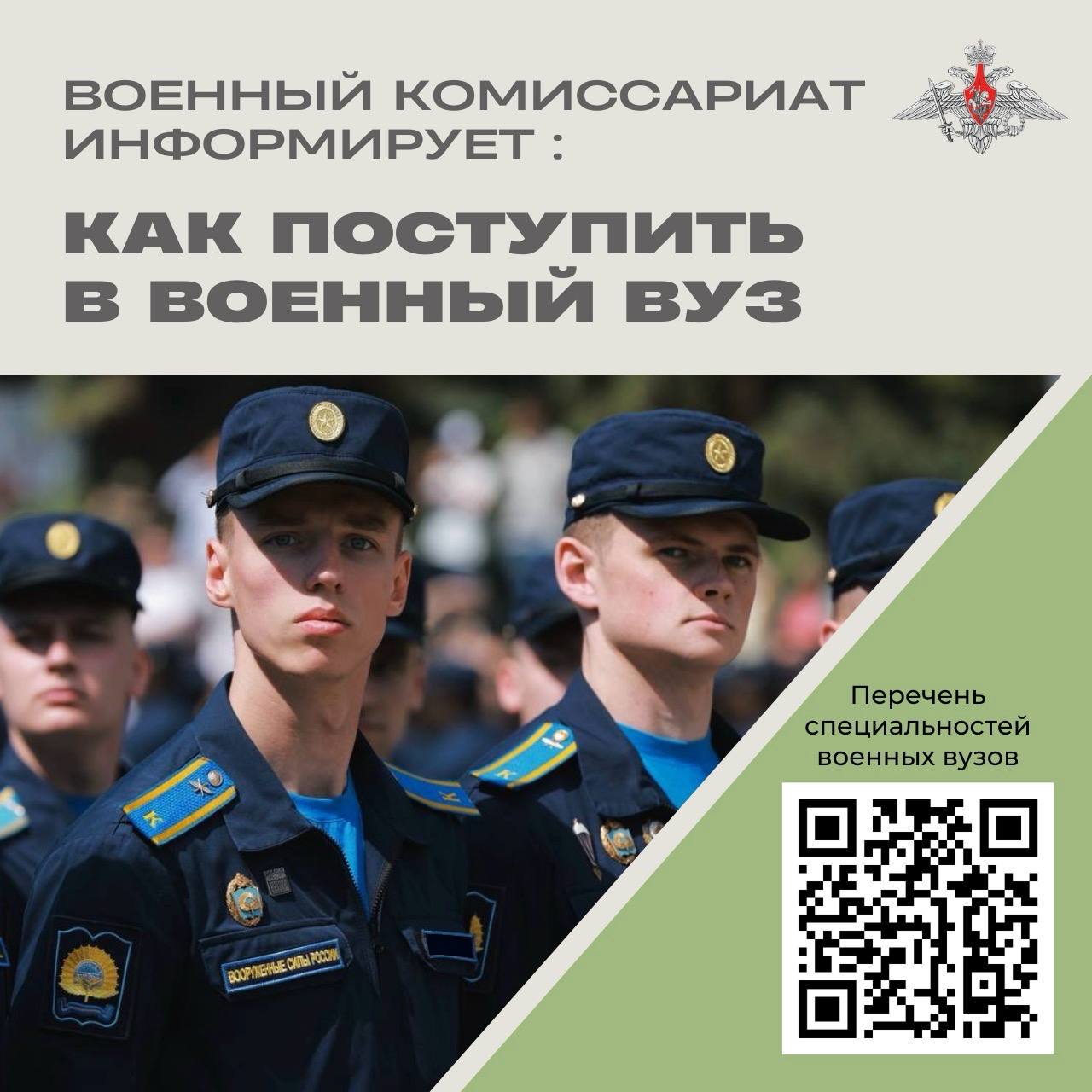 С полным перечнем вузов и специальностей можно ознакомится на сайте Минобороны РФ: https://vuz.mil.ru/Perechen-specialnostei