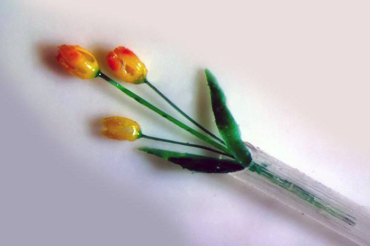 Из смолы и красок Анатолий Коненко создал крошечный букет тюльпанов. Размер каждого бутона - 0,1 миллиметра, а стебли помещаются в волос человека!
