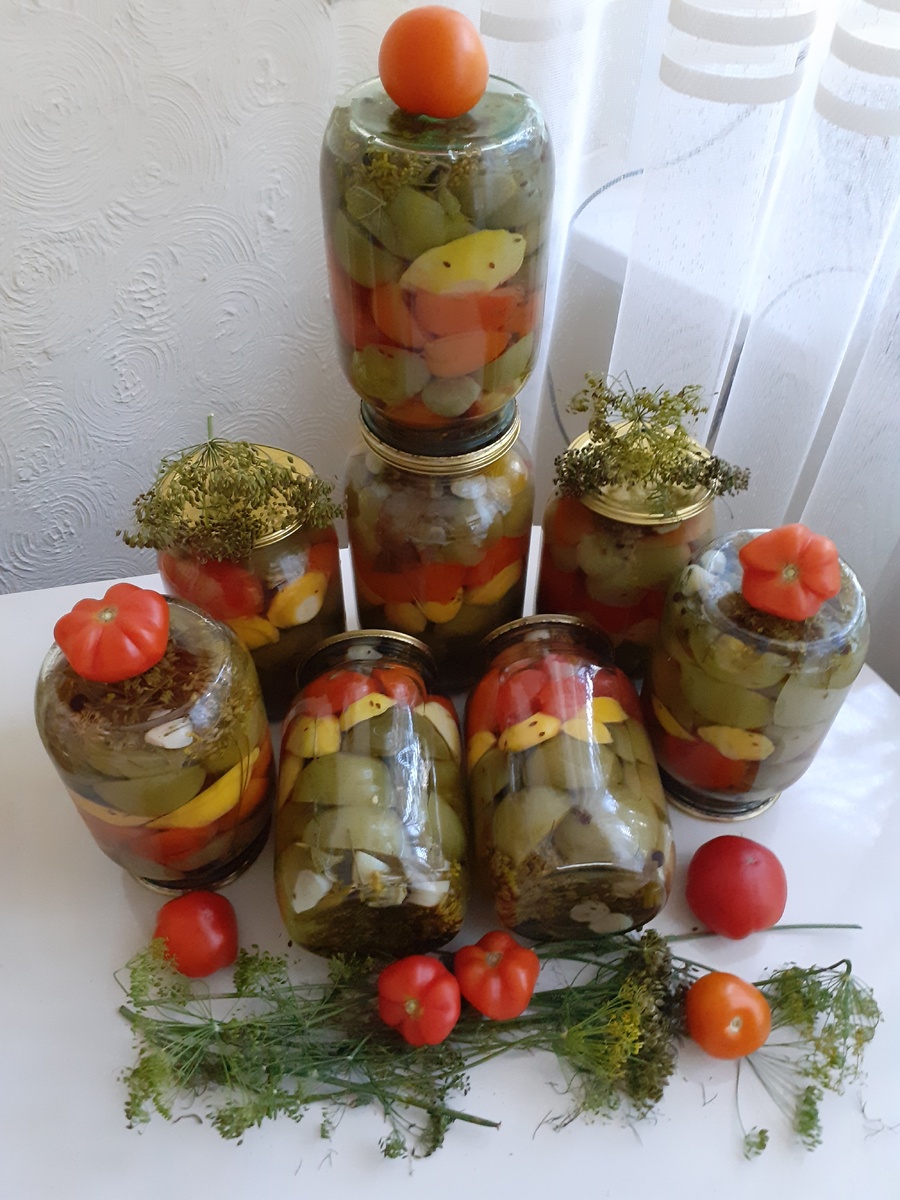 Банки объемом 1 литр следует промыть и стерилизовать в духовке в течение 10 минут при температуре 130°C. Составляющие приправы, кроме соли, сахара и уксусной эссенции, нужно быстро бланшировать в кипящей воде, после чего выложить в подготовленные банки слоями: сначала салат, затем помидоры, перемежая с приправами. Зеленые и патиссоны должны быть бланшированы около 3-4 минут, а спелые томаты достаточно опустить в кипяток на 5-6 секунд.