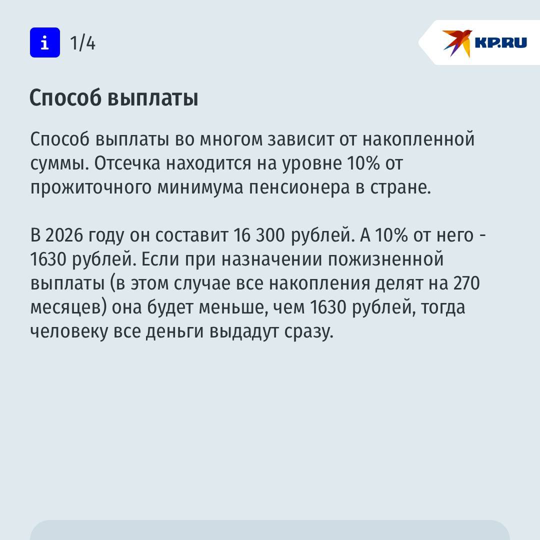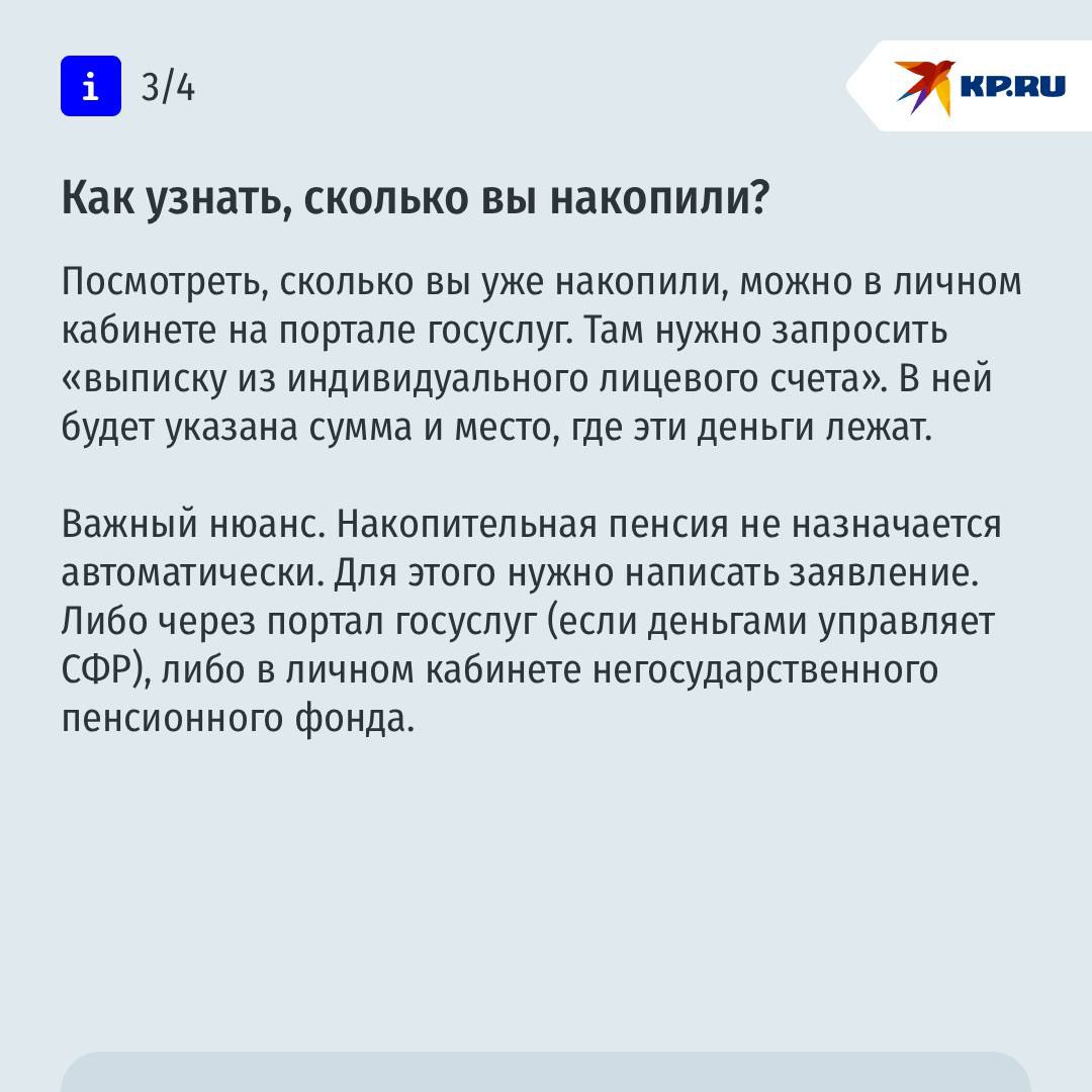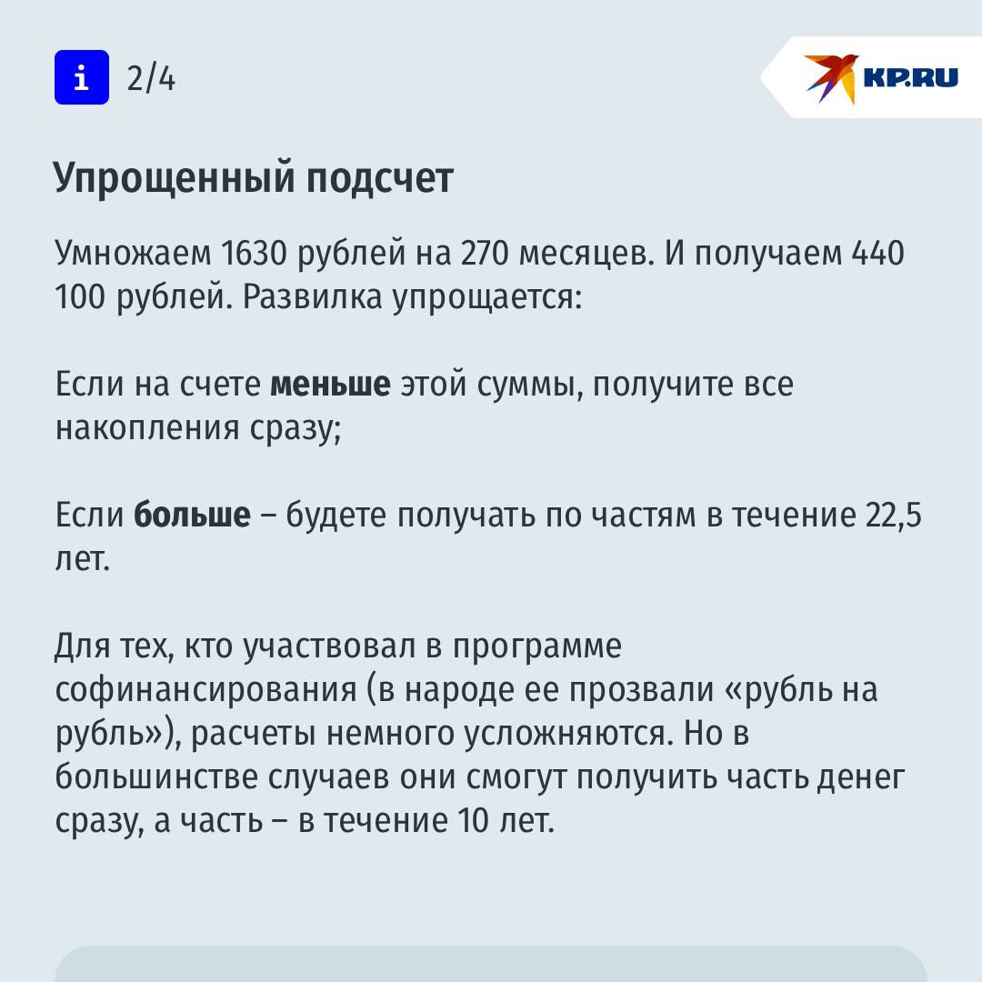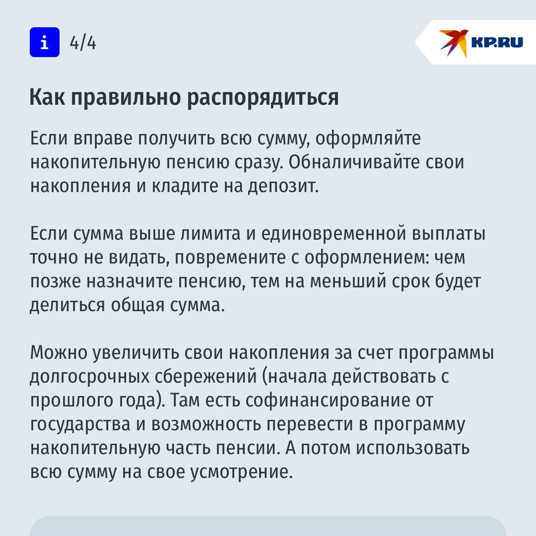 Правила одинаковые для всех – и для тех, кто держит накопления в Социальном фонде, и для тех, у кого они лежат в том или ином НПФ. Общее число тех, кто сможет получить свои накопления, составляет почти 2 млн человек. Средняя сумма, лежащая на счете, - около 100 тысяч рублей. Но есть и те, у кого накопилось под миллион. Но деньги эти люди получат по-разному. Подробности – в карточках