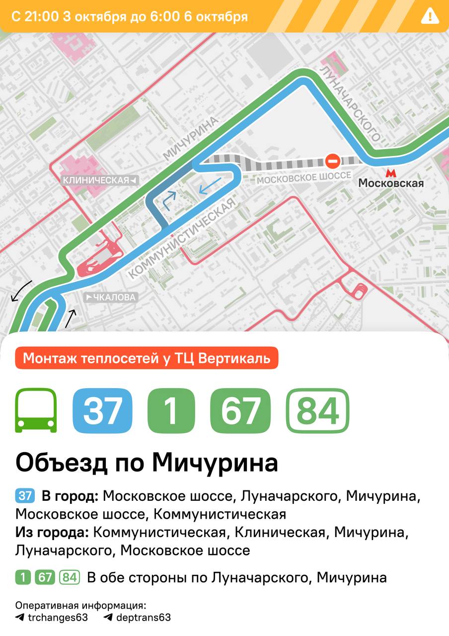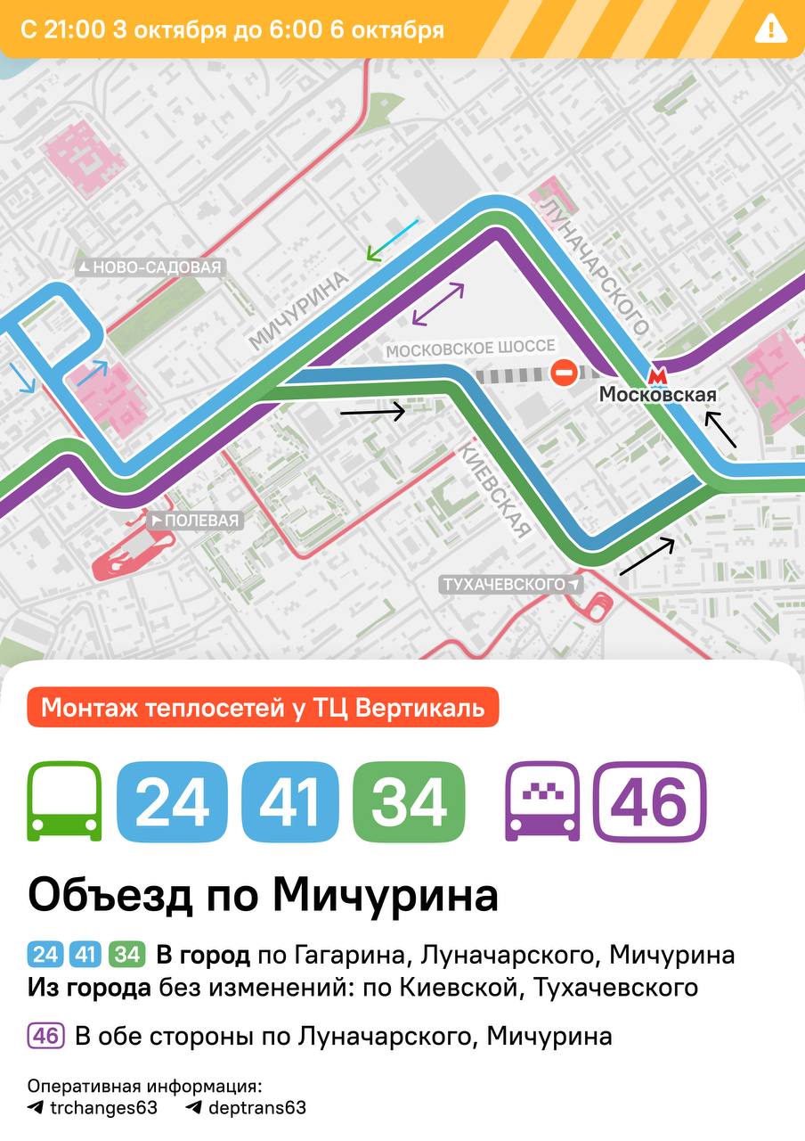 Причина - движение по Московскому шоссе перед кольцом на улице Луначарского ограничат для прокладки теплосетей. Из-за этого меняется и схема движения общественного транспорта. Изменения продлятся с 21:00 3 октября до 06:00 6 октября.