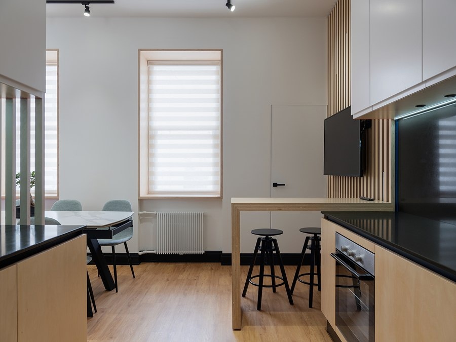 - Комбинация гладких стен с деревянными панелями создаёт гармонию и стиль.