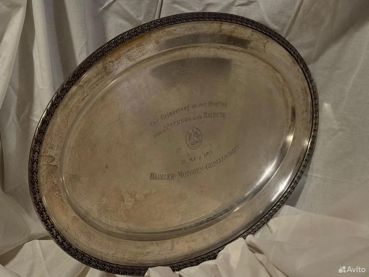 Серебряный антикварный поднос «Daimler-Motoren-Gesellschаft» 1913 года продают за два миллиона рублей. Был выпущен к дальнему перелету самолета между Ютербогом в Маленте.