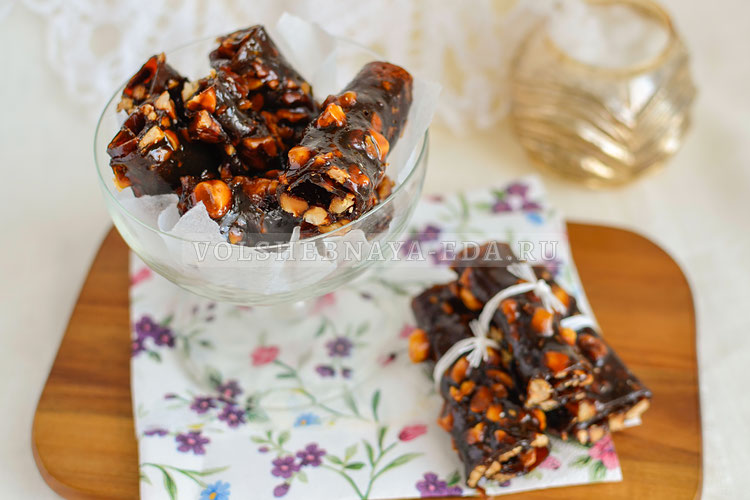 Не забудьте добавить в виноградную массу порубленные орехи по вашему выбору. После этого выложите полученную массу на противень, застеленный пергаментом, и сушите в духовке при температуре 60-70 градусов в течение 5-6 часов. Проверить готовность пастилы можно, слегка нажав на неё: если она не прилипает к пальцам, значит, пора убирать из духовки.