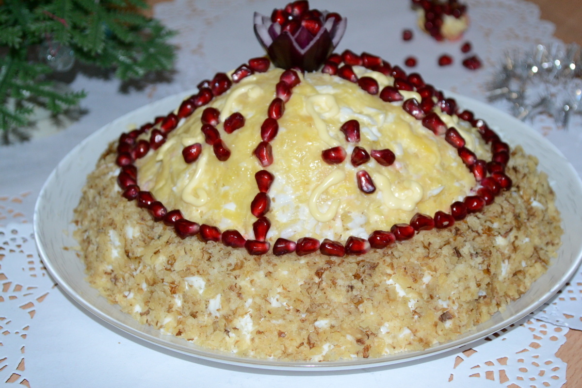 С использование натертого сыра и желтков, салат окончательно формируется, добавляя нотку благородства, и завершается оформлением с гранатовыми зернами. Создание "Шапки Мономаха" превращается в увлекательное творчество, позволяя продемонстрировать кулинарное мастерство и украсить стол к любому празднику.