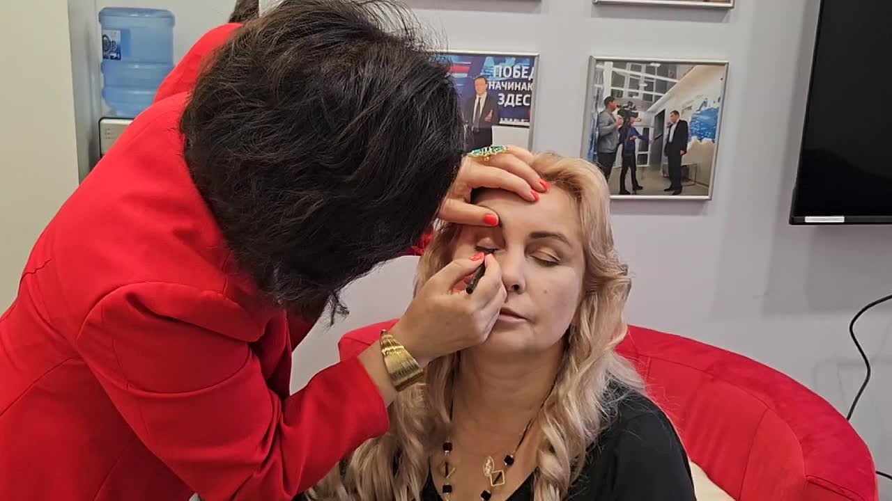 Нашу героиню готовят к выходу в студию: визажист уверенно творит чудеса, делая взгляд ещё выразительнее, а образ — безупречным.