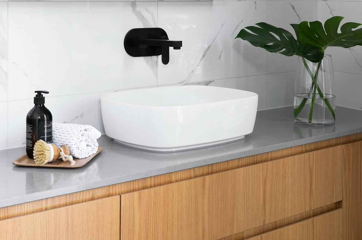 - Столешницы под накладные раковины — позволяют с легкостью выбрать желаемую форму и размер, а также упрощают установку сантехники.