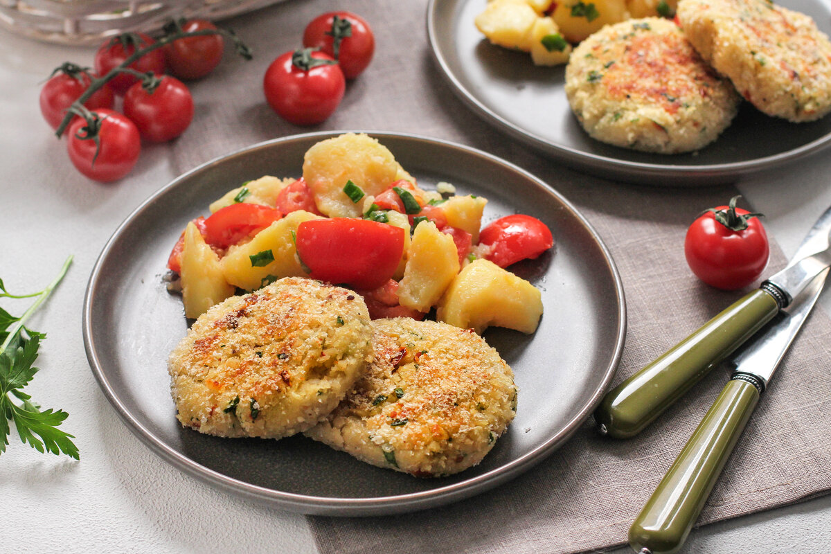 Шаг 3: На этом этапе нарежьте зеленый лук и помидоры. В большой миске объедините картофель, нарезанные помидоры и зеленый лук, приправив оливковым маслом. Все хорошо перемешайте. Для соуса нарежьте красный лук и чеснок, смешайте с протертыми томатами. Подавайте котлеты из фасоли с картофельным салатом и соусом.