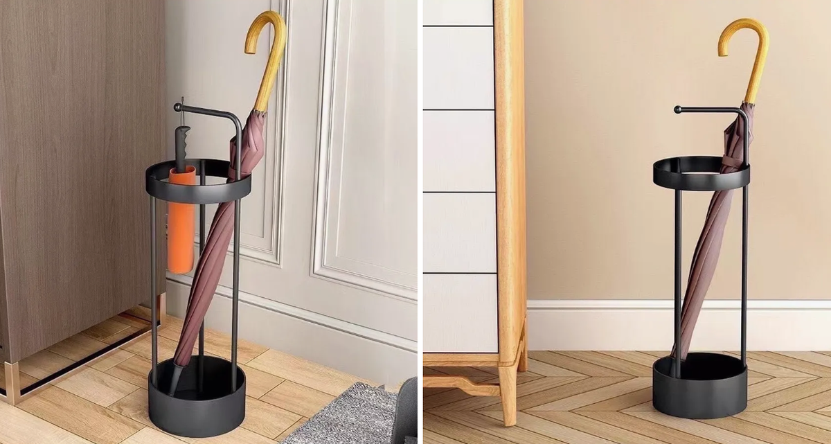 - Подставка для зонтов — не только стильное решение, но и способ избежать луж на полу. Современные подставки имеют специальные поддоны для воды, что делает ваш коридор аккуратным и чистым. К тому же, такая подставка отлично подходит для хранения свернутых ковриков для йоги или тростей.