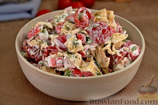 - Салат с крабовыми палочками и овощами: Легкое сочетание свежих помидоров, яичных блинчиков и крабовых палочек идеально подходит для праздничного стола.