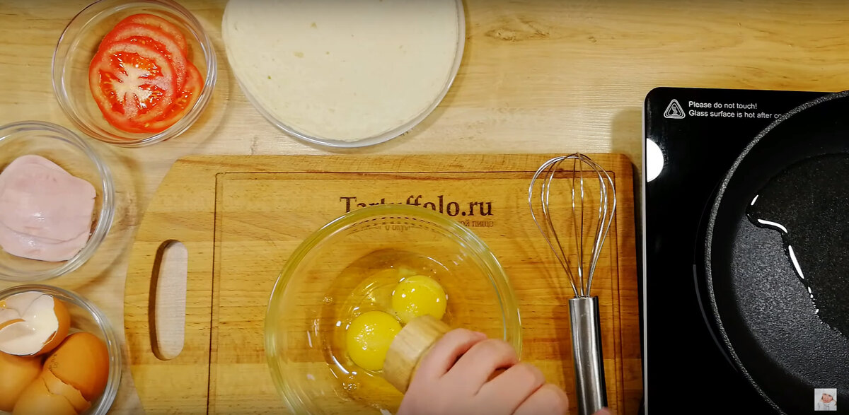 Следующим шагом станет укладка лаваша. Его следует аккуратно прижимать к яичной массе, чтобы он равномерно сцепился с омлетом. После этого, как только яйца подрумянятся, следует осторожно перевернуть массу. Теперь можно добавить начинку по вкусу: ломтики ветчины, свежие помидоры и тертый сыр. Накрывая сковороду крышкой, можно дождаться, пока сыр полностью расплавится.