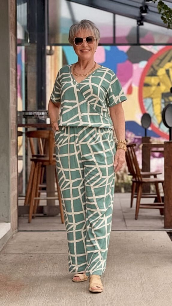 - Легкий брюочный костюм. Летние дни — идеальное время для костюмов из натуральных тканей. Не бойтесь поэкспериментировать с принтами и расцветками. Брюки свободного кроя в сочетании с блузкой на запах создадут непринужденный и стильный образ.
