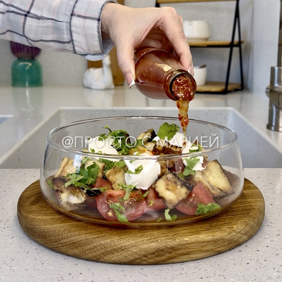 Нарежьте помидоры крупными кусками и выложите на дно салатника. Следом добавьте нарезанную кинзу и обжаренные баклажаны. Завершите приготовление творожным сыром и щедро полейте сладким чили соусом. Посыпьте кедровыми орешками, чтобы подчеркнуть текстуру блюда.