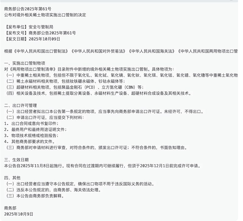 Объявление Министерства коммерции Китайской Народной Республики №61 от 2025 года