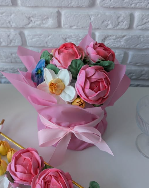 Сделанные вручную зефирные цветы привлекают внимание не только своей красотой, но и творческим подходом к созданию. Центральные элементы композиции составляют пышные пионы, выполненные из розового зефира. Эти цветы, с их яркими и округлыми лепестками, прекрасно дополняют сторонние элементы.