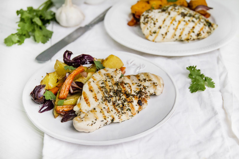 Пока овощи запекаются, подготовьте куриное филе: промойте, обсушите, нарежьте на стейки и натрите оставшимися травами, приправив солью и перцем.
