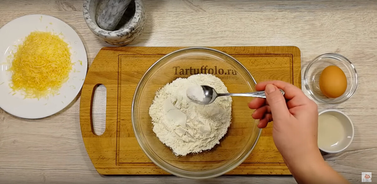 Для начала в глубокой миске соединяют муку с солью, сахаром и разрыхлителем. Содержащиеся в смеси ингредиенты стоит хорошо перемешать, чтобы они равномерно распределились. Затем в ступке немного измельчают тмин и добавляют его к муке, чтобы добавить яркий аромат. Для насыщенного цвета в смесь добавляется щепотка куркумы.