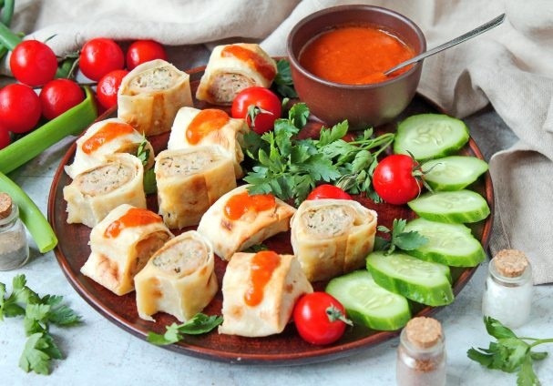 3. Лаваш нарезать на длинные и широкие полоски. В центр каждой полоски положить кебаб и посыпать тертым сыром, затем завернуть рулетом.