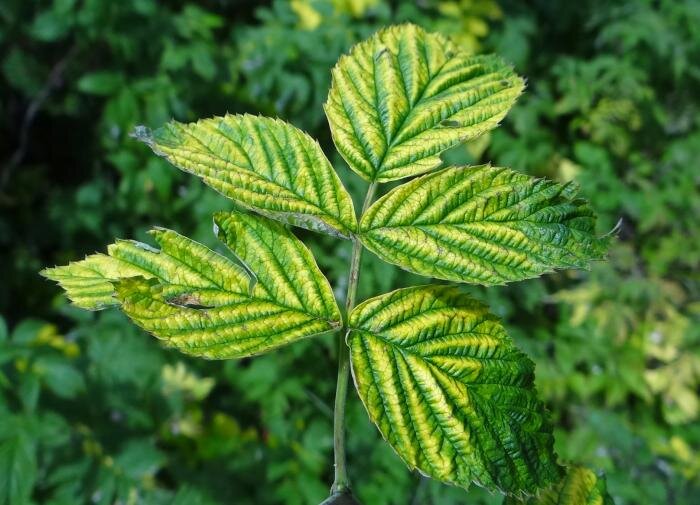 - Желтизна листьев при сохранении зелёного цвета жилок.