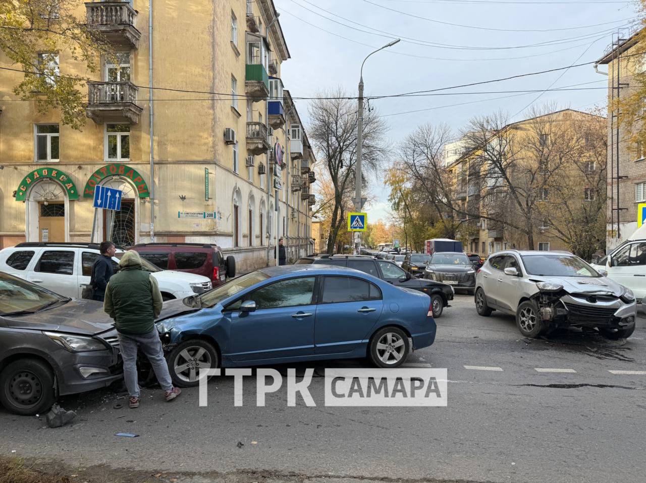 Столкнулись два автомобиля Hyundai, Honda и Nissan. Движение почти полностью парализовано.
