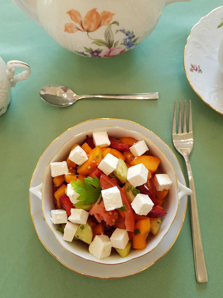 Салат раскладывают по тарелкам, а сверху щедро посыпают нарезанным кубиками сыром фета. Этот яркий и легкий салат станет не только вкусным дополнением к любому обеду, но и эффектным украшением стола. Приятного аппетита и теплого настроения!