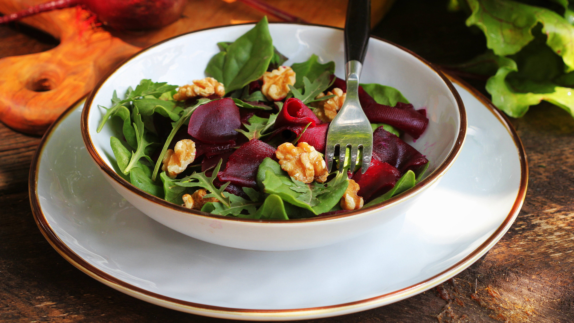 На широкое блюдо поместите промытую и просушенную зелень. Сверху на нее выложите фету, свеклу и присыпьте орехами с гранатом.