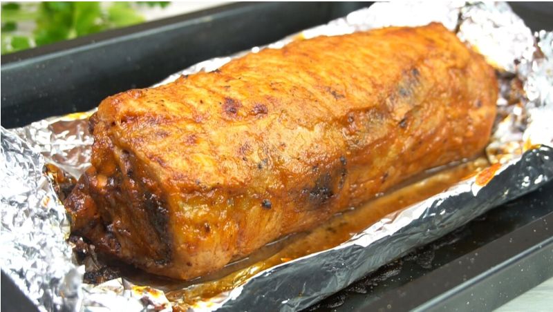 Рулет обжаривается на раскалённой сковороде со всех сторон до золотистого цвета. Это создаст аппетитную корочку и сохранит все соки внутри. Далее рулет заворачивается в фольгу и помещается в духовку, разогретую до 200 градусов. Готовить его следует около 35 минут.