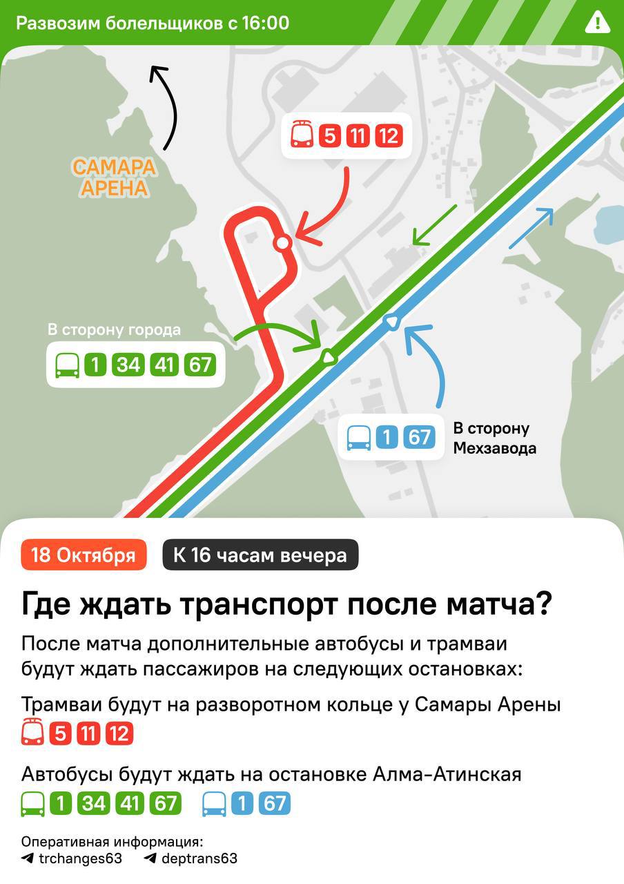 С 12:00 и до старта игры автобусы № 1 и № 67 будут следовать со всеми остановками по улицам Дальней, Арена 2018 и Волжскому шоссе (в обоих направлениях) и будут заезжать на территорию стадиона. Напомним также, что до стадиона пролегает автобусный маршрут № 83. Кроме того, можно воспользоваться автобусами №№ 45 и 51, проходящими по Московскому шоссе, и выйти на остановке «Улица Алма-Атинская», от которой стадион находится в пешей доступности.