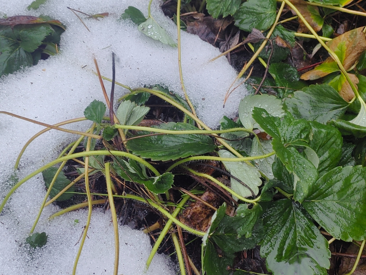Невзирая на то, что зимовали кустики клубники довольно оптимистично, февральские морозы, достигшие 16 градусов ниже нуля, оставили их в печальном состоянии. Внешне кусты выглядели не так плохо, но при более внимательном осмотре стало очевидно, что многие листья побурели, напоминая о зимних испытаниях.