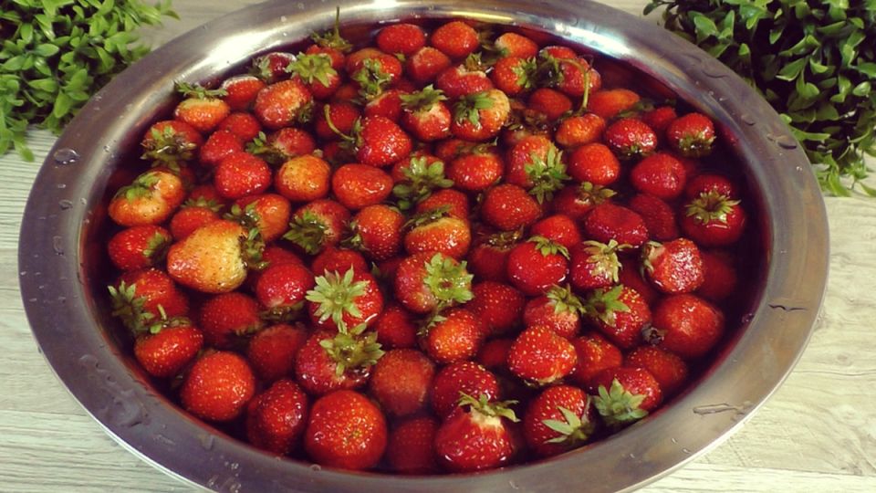 Клубнику нужно хорошо промыть и удалить хвостики. После этого ягоды высушиваются на бумажном полотенце. Необязательно использовать только красивые плоды — самые обычные ягодки также отлично подойдут. Их следует немного помять, чтобы выделился сок.