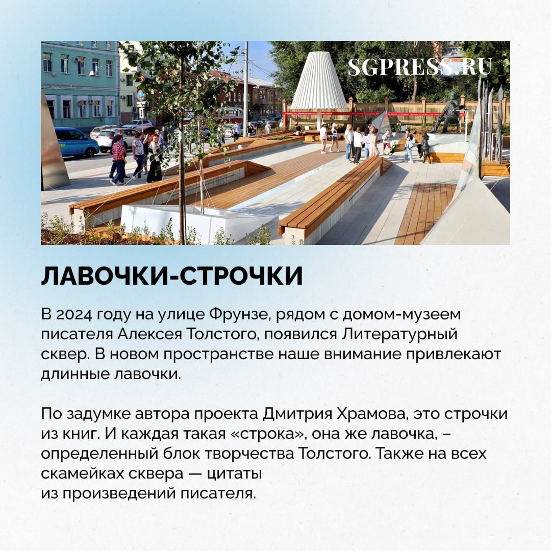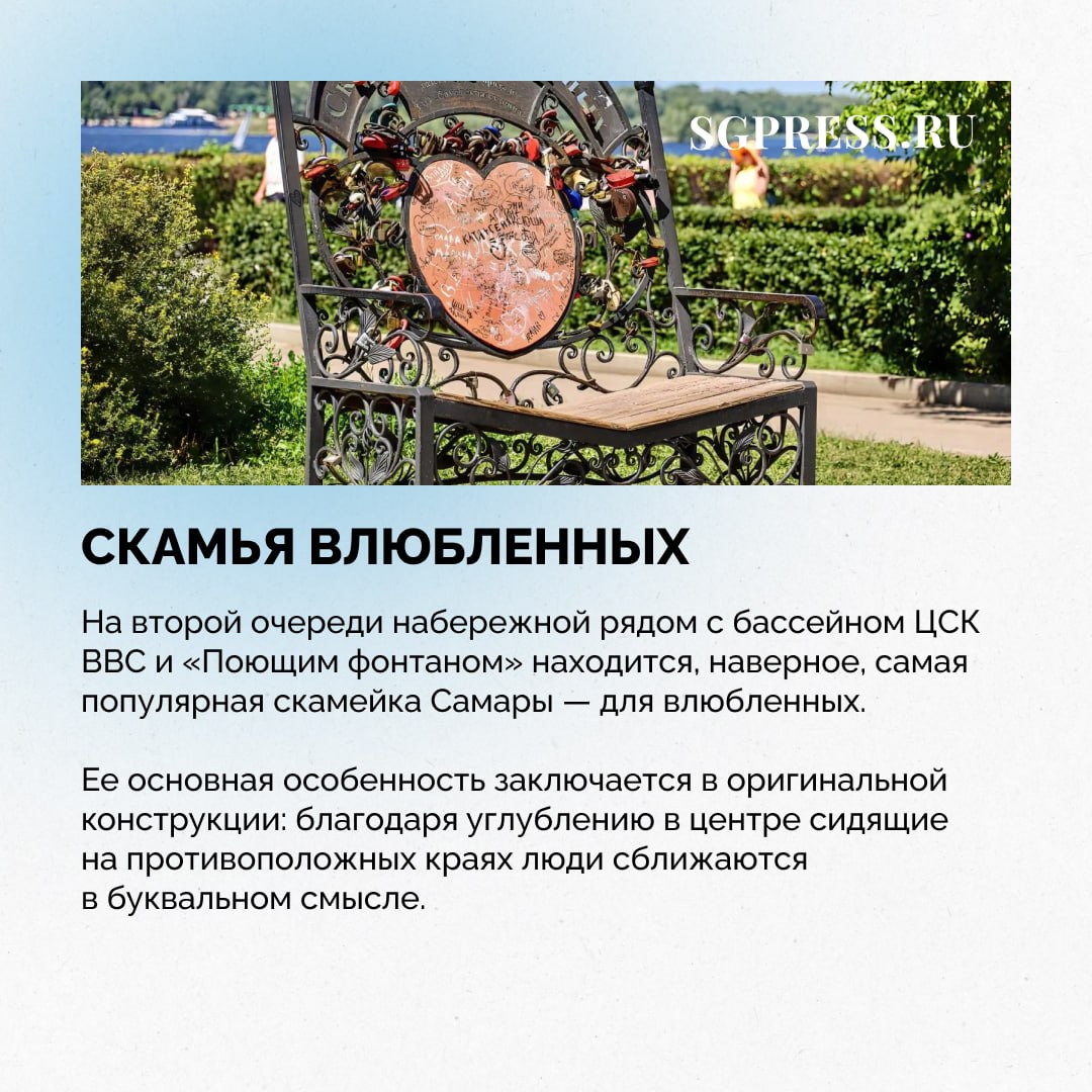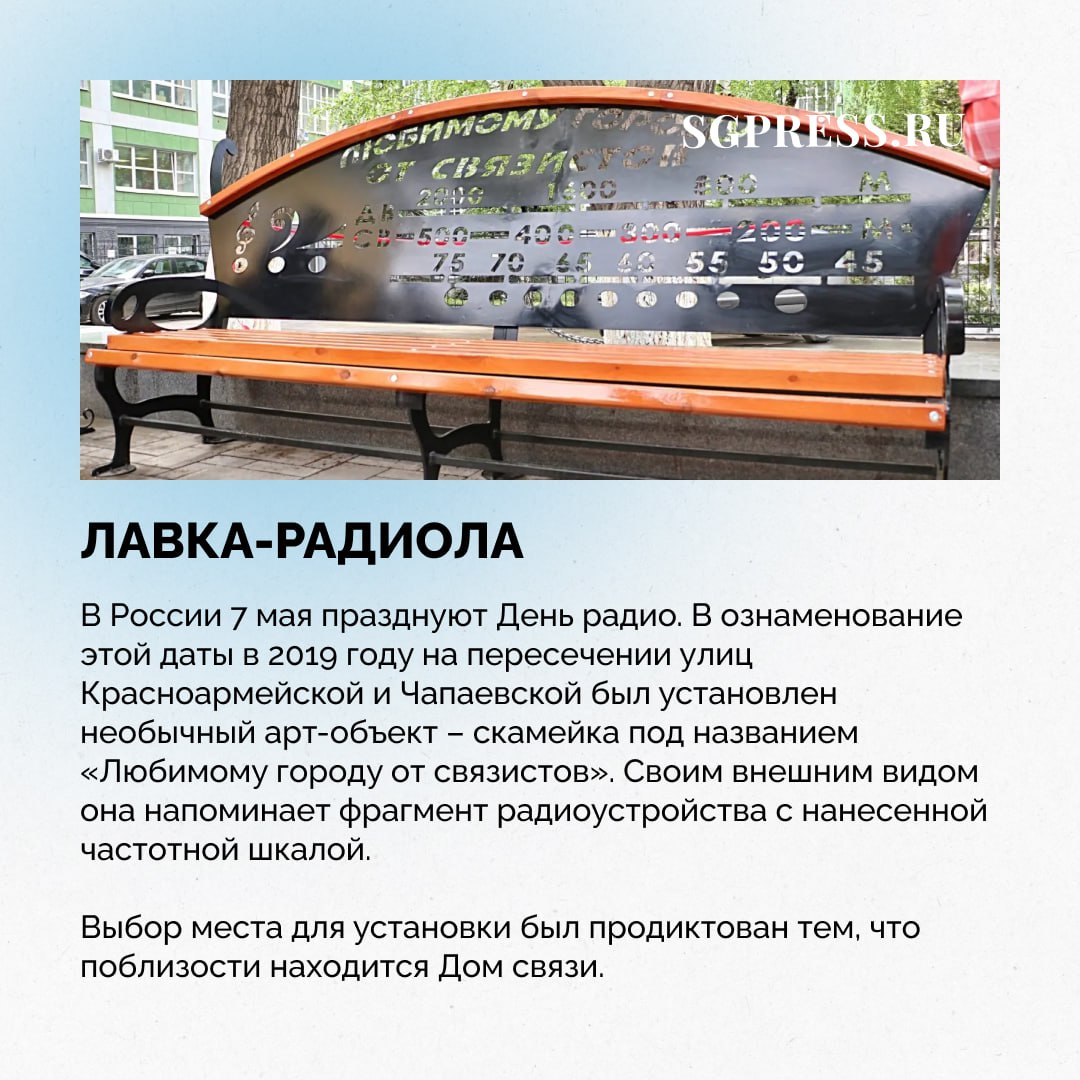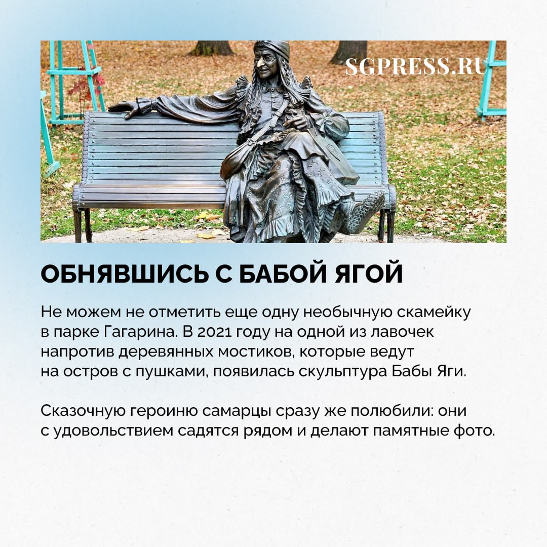 В Самаре можно найти множество оригинальных мест для отдыха. Лавка-радиола, скамья влюбленных, лавочки-строчки и даже скамейка с Бабой Ягой: мы собрали самые интересные и запоминающиеся скамейки города.